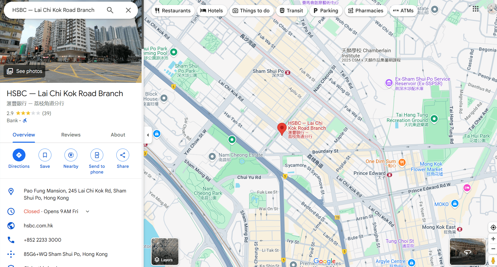 其实深水埗地铁站附近,汇丰、工银亚洲、中银香港三家银行都有,如果能都约到这里,那会非常的方便。(PS:不要使用高德,什么地方都搜不到,老老实实Google Map好吗?)