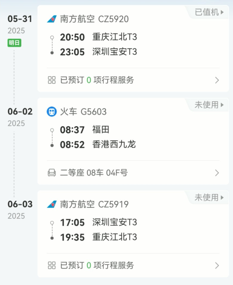 去香港无非飞机直达或者深圳中转。重庆-香港直飞常年单程1000+,而飞深圳只需要300,南航飞大湾区还有送80r无门槛高铁券/大巴券,可以免费往返香港,怎么选应该显而易见了。